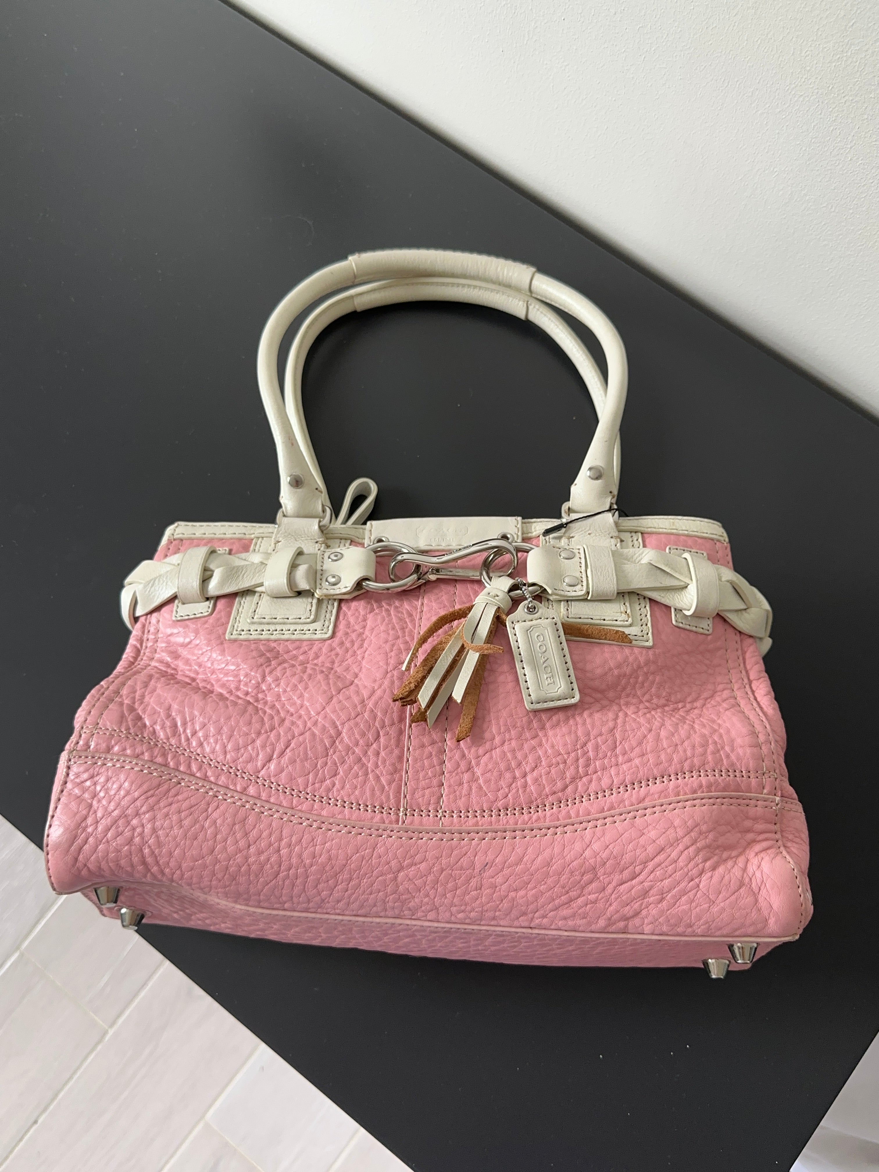 バッグ Coach Signature Tassel Pink Satchel Bag Pink White Pebbled Leather Satchel Handbag Braided Tassel – Avior